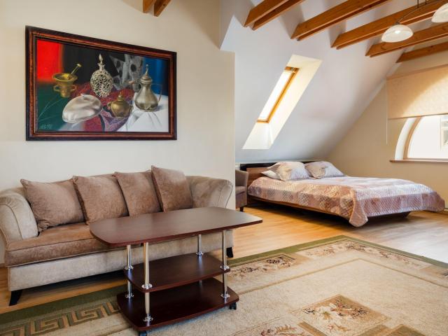 Didelė, jauki dviejų kambarių erdvė su prieškambariu, įrengta atskiro pastato palėpėje ir pritaikyta poilsiaujančiai šeimai ar pavieniams svečiams.